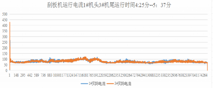 数据分析:此变频器采用最新研发的转矩板控制系统,可以更好地平衡运行电流;刮板机 1-3#机头机尾电机运行电流曲线基本重叠,最大启动尖峰电流为429A,平均运行电流为78A, 设备运行平稳满足生产要求。